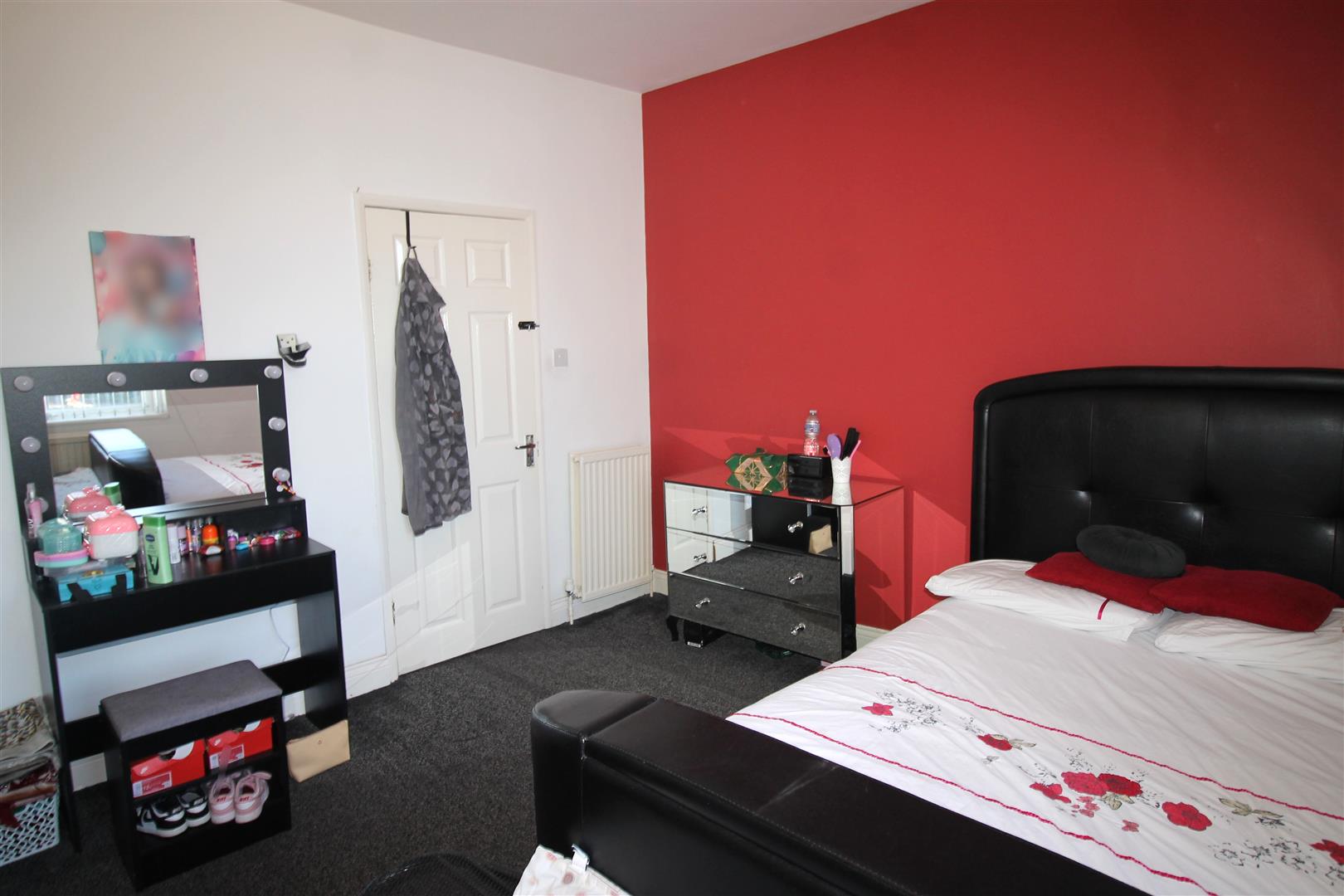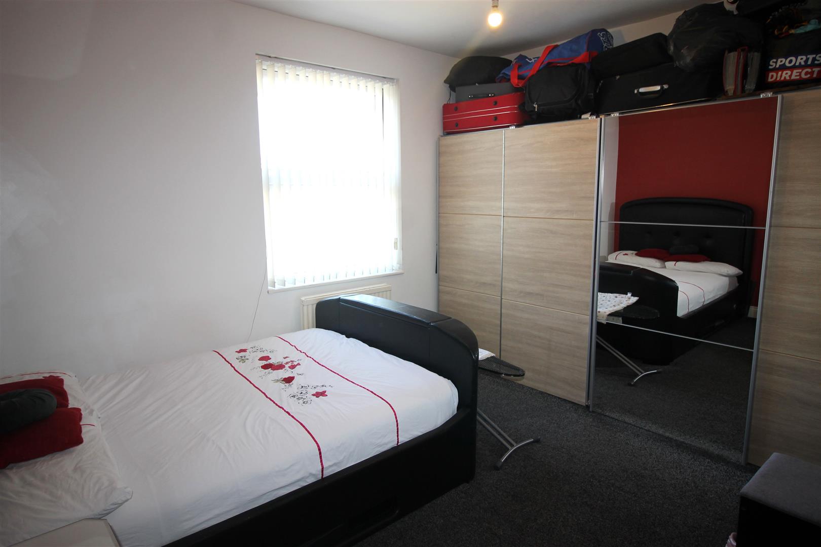 A spacious double bedroom offering comfortable accommodation with a window and radiator, ideal for a main bedroom.